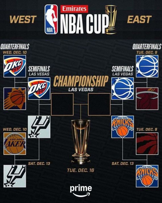 北京时间12月11日,NBA杯四强正式出炉,尼克斯、魔术、雷霆、马刺携手挺进拉斯维加斯。半决赛时间安排如下——