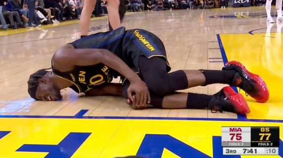 第三节还剩下7分多钟的时候,巴特勒和小米切尔争抢球权时倒地,随后巴特勒痛苦地捂着自己的膝盖,之后勇士立刻叫暂停,队医、队友和主帅科尔都上前查看其伤势。巴特勒在地板上躺了很久,才在队友的搀扶下,返回更衣室接受进一步治疗。他的右脚无法承重,离场前,顽强的巴特勒挤出了令人心酸的笑容。