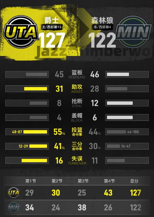 全场具体比分(爵士队在后):34-29、24-30、38-25、26-43。