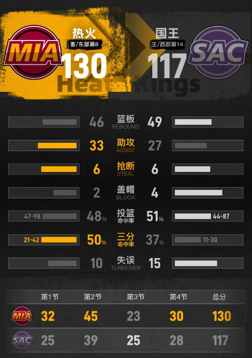 最后一节,热火队已经建立了明显的领先优势,牢牢把握比赛主动权,国王队没有机会反击。随着比赛接近尾声,热火保持优势,最终以130-117赢下比赛,顺利取得胜利。