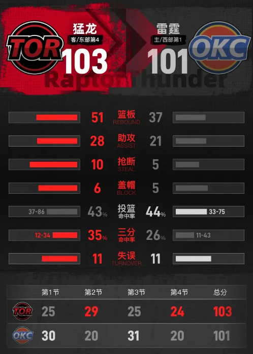 第四节,雷霆开局阶段打出强劲攻势,一度以92-86领先。然而,猛龙不甘示弱,迅速展开反击,不仅抹平了比分,还实现了4分的反超。比赛小节的后段,雷霆奋力追赶,努力拉近分差。猛龙的奎克利在这一节中表现出色,独得11分,其中的3记三分球更是彰显了他的火热手感。最终,猛龙以103-101赢得比赛的胜利。