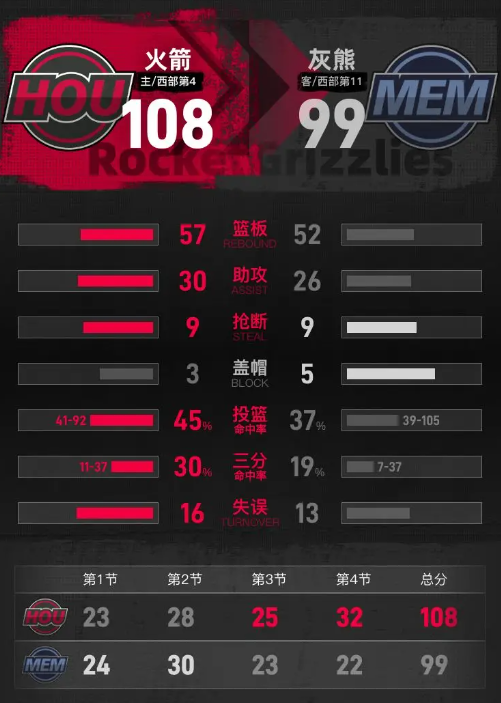 第四节,火箭步入状态,迅速发力,将比分追平后进一步反超,领先优势一度扩大至11分。灰熊在后段展开反击,试图缩小分差。最终,火箭的申京表现出色,单节获得12分,帮助球队以108-99拿下比赛。