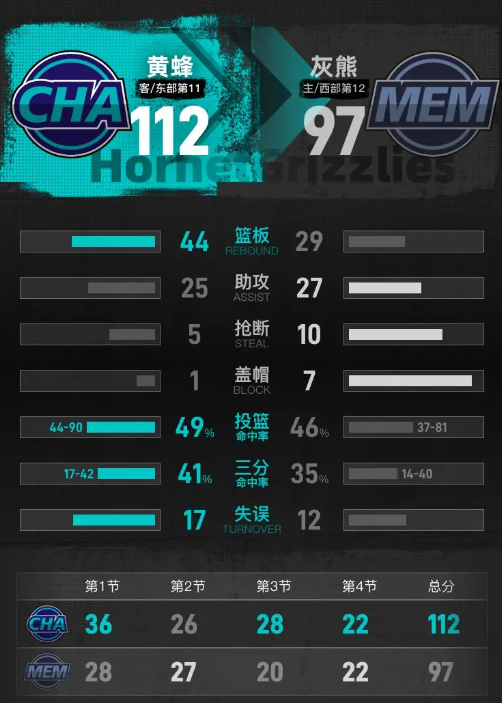 进入第四节,灰熊继续发起反击,将比分追至77-90。然而,黄蜂再度发力,迅速将分差扩大至22分。尽管灰熊在小节后段努力追赶,再次将比分拉近,黄蜂的迪亚巴特发挥出色,全场收获12分,其中包括1记三分。最终,黄蜂以112-97赢得了比赛。