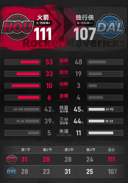 第四节,火箭和独行侠战况胶着。本节比赛独行侠的弗拉格获得10分。第四节,火箭以111-107赢下比赛。